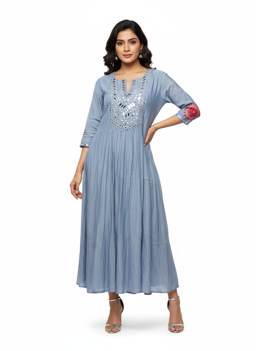 Step into timeless elegance with the Dusty Blue Mul Chanderi Anarkali Dress, a masterpiece crafted for Indian-American women who value tradition with a modern twist. Made from premium pure Mul Chanderi fabric, this dress is celebrated for its ultra-lightweight feel, airy drape, and subtle sheen, offering unmatched comfort and sophistication. Perfect for festive gatherings, weddings, and evening parties, its serene dusty blue hue exudes understated grace, while vibrant pink embroidery on the sleeves adds a playful, eye-catching contrast. The true highlight is the intricately hand-designed yoke featuring sparkling mirror work in a geometric V-pattern. These mirrors glisten beautifully with every movement, ensuring all eyes are on you. Designed with a relaxed, flared silhouette, this Anarkali offers effortless movement and a flattering fit for any occasion. Styling this piece is a breeze—pair it with silver jhumkas, mojaris, and a statement clutch for a classic festive ensemble, or opt for minimalistic jewelry for a chic, contemporary vibe. To maintain its pristine charm, hand wash it in cold water with mild detergent and dry in the shade. Whether you're celebrating Indian traditions or attending a cultural gathering, this exquisite Anarkali dress is a wardrobe essential for those who appreciate impeccable craftsmanship and heritage-inspired fashion.