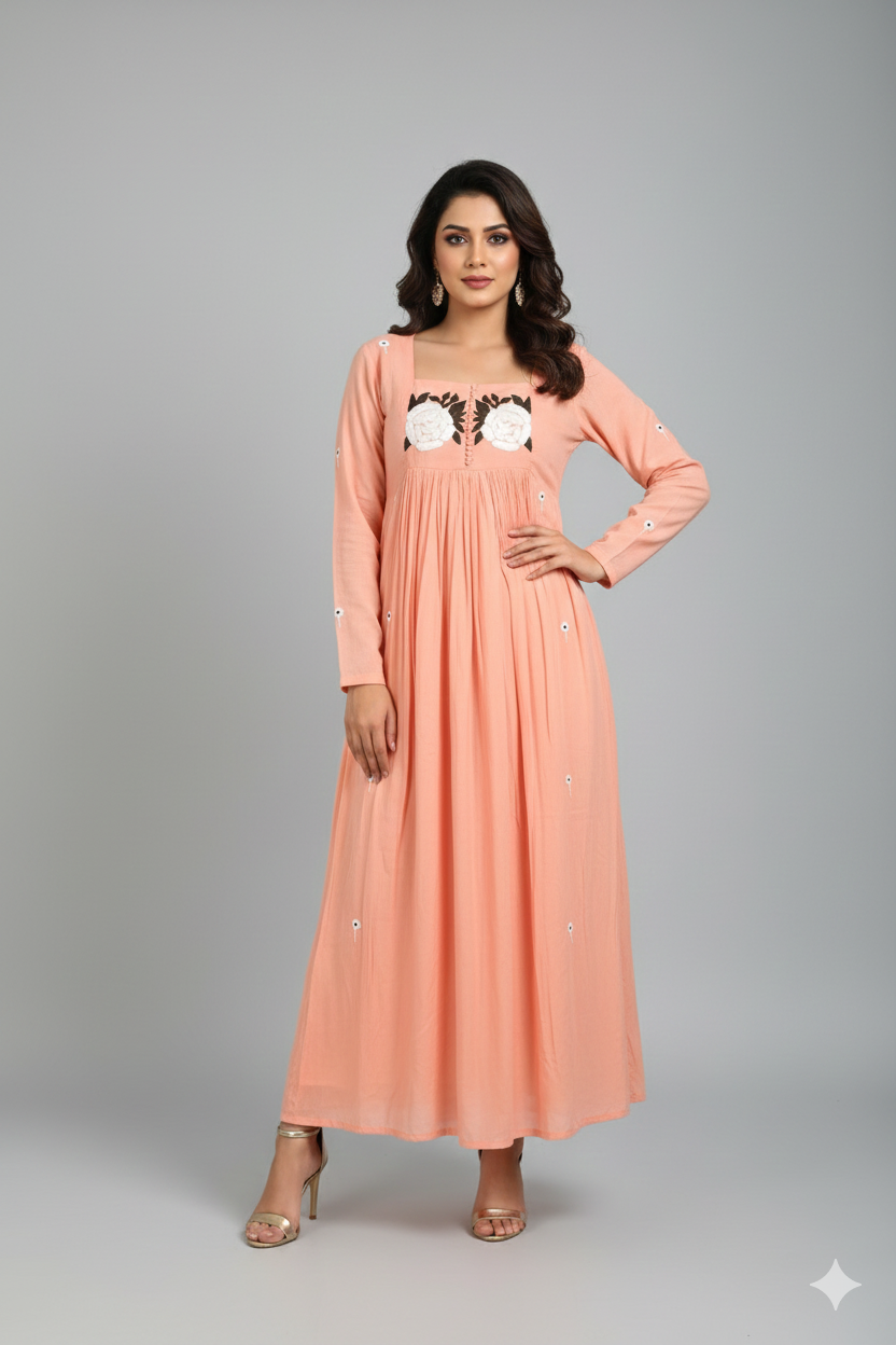 Elegant Soft Peach Mul Cotton Dress with Floral Embroidery is priced at $35.00. Feel free to message us on WhatsApp if you have questions about pricing or want to discuss bulk orders.