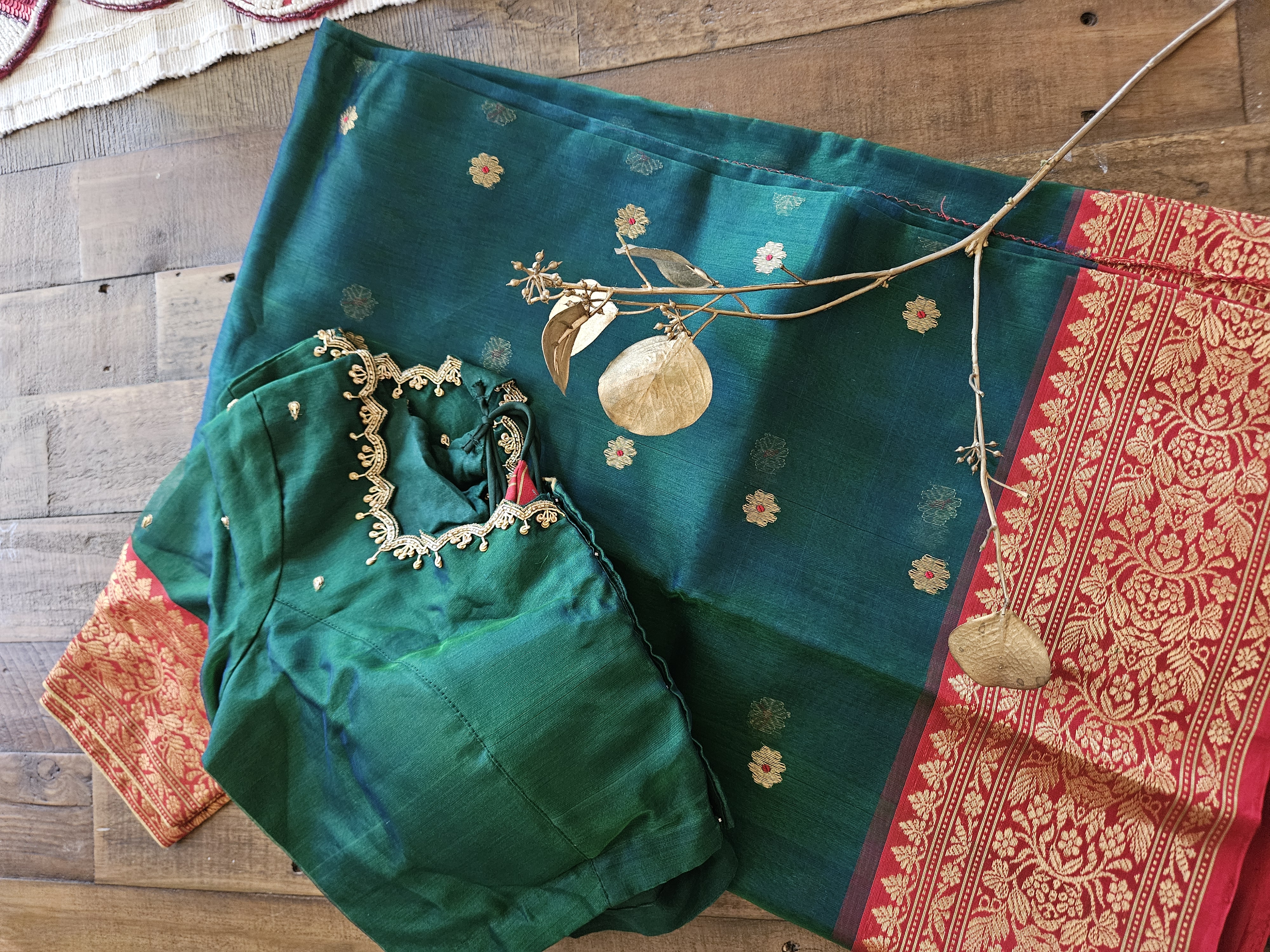 Follow the care instructions that come with Handwoven Pure Chanderi Silk Saree with Zari Borders & Regal Motifs. Generally, dry cleaning works best for delicate fabrics. Store in a cool, dry spot away from direct sunlight.