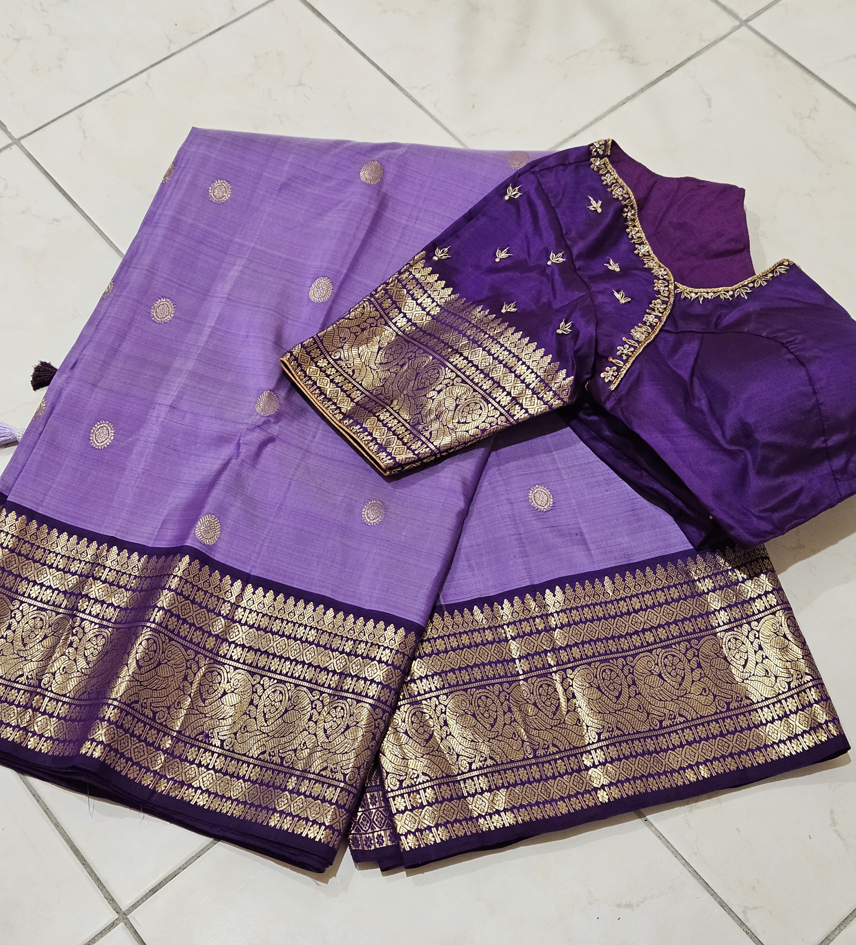Experience the epitome of elegance with our Radiant Purple Luxury Kanchipuram Saree, meticulously handcrafted by master weavers using 2gm pure gold zari. This exquisite saree embodies the rich heritage of Kanchipuram craftsmanship, celebrated for its unmatched artistry and superior silk quality. The luminous purple hue, paired with intricate gold zari motifs, creates a regal aesthetic that effortlessly complements any skin tone. Perfect for grand occasions like weddings, festive celebrations, and cultural gatherings, this saree elevates your style with its timeless charm and sophistication. Designed to be a treasured heirloom, the saree boasts a buttery-soft texture and a luxurious fall, ensuring both comfort and elegance. Pair it with traditional temple jewelry or modern statement pieces to create a stunning ensemble. For long-lasting beauty, store your saree in a cotton-lined bag and opt for professional dry cleaning only. With its captivating design and unparalleled craftsmanship, this saree is not just an outfit—it’s a celebration of your roots and the legacy of Indian tradition. Make a lasting impression and cherish this masterpiece for generations to come.